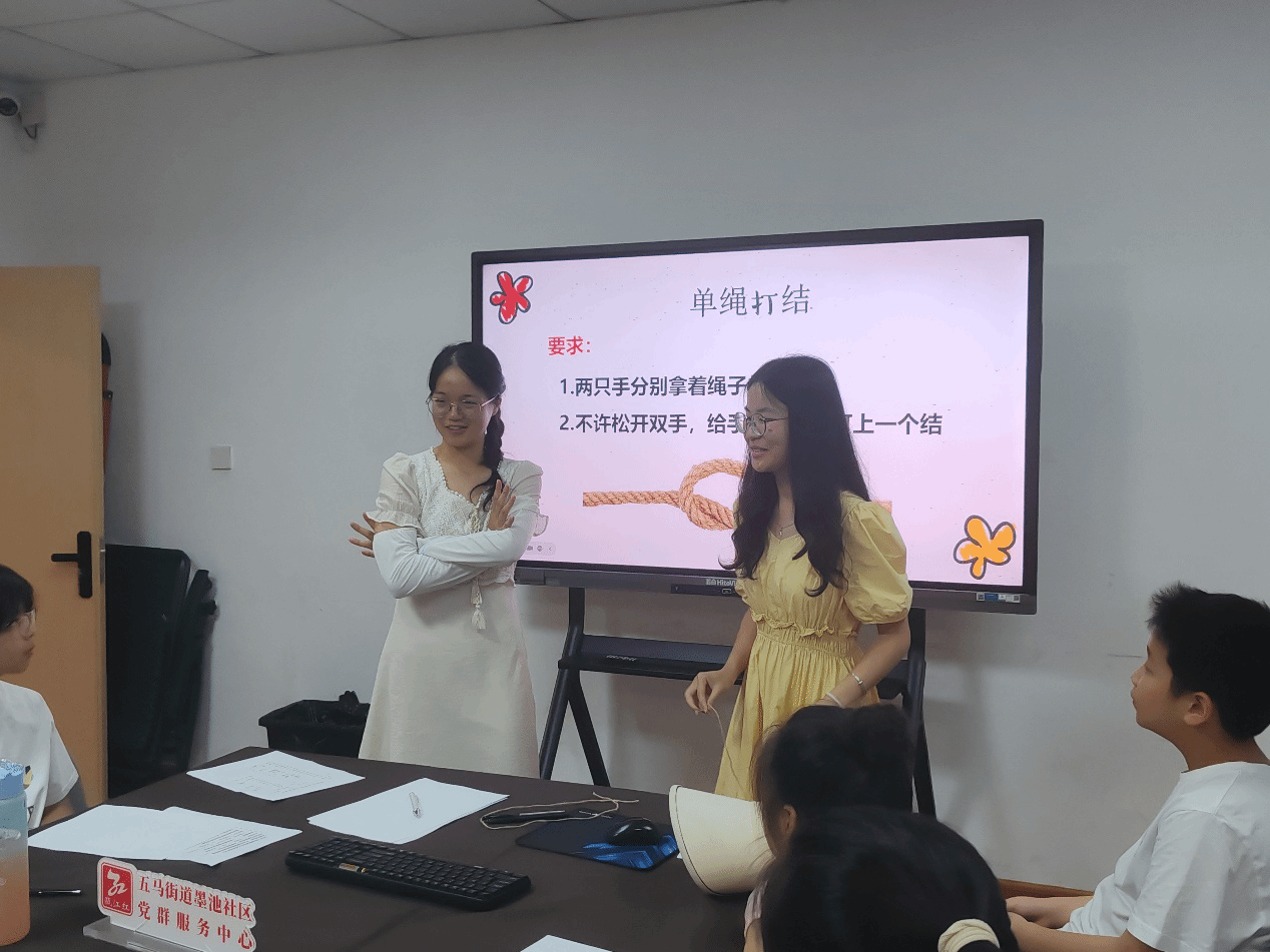 墨池社区活动室内,思维的星火被悄然点燃。上午九点半,“学习提升——思维的魔力”课堂正式开启。实践队员以巧妙的麻绳打结游戏为引,牵引20位1-6年级的孩子在创新思维迷宫中穿梭。当孩子们尝试解开不松开手打结的谜题时,逻辑的壁垒在无形中被击穿,探索的欢欣跃然于稚嫩脸庞。